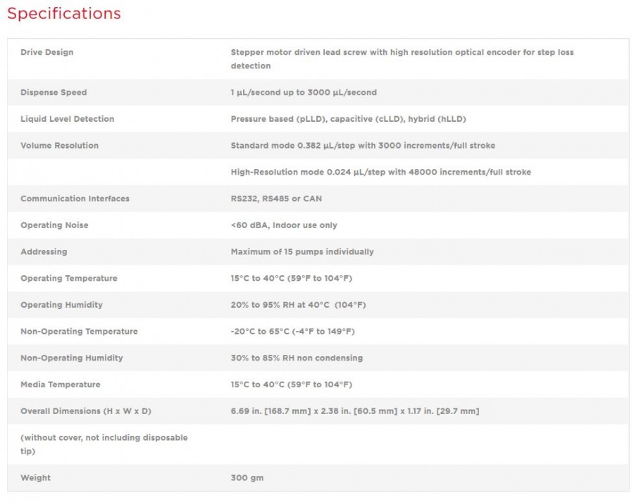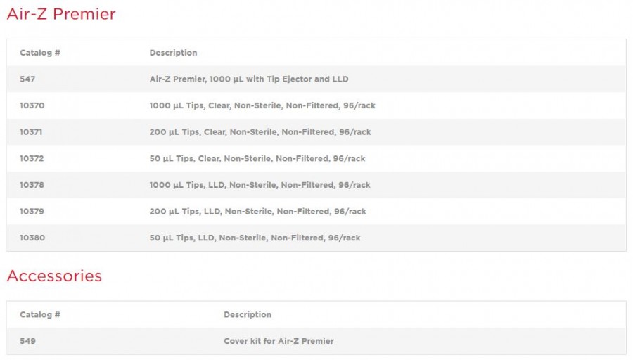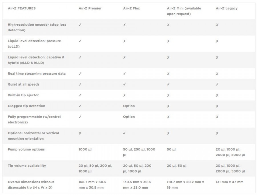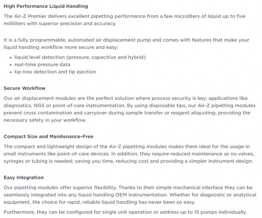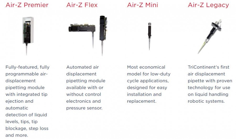 Air-Z Premier 관련링크 https://youtu.be/d9MSsEI9qP0 52회 연결 이전글 다음글 목록 본문 Air Displacement Pumps Excellent pipetting accuracy and precisionIdeal for moving small sample volumesNo cross-contamination and carry-over (e.g. ideal for transferring blood samples)Reduced instrument maintenance as no valves, syringes or tubing requiredIdeal for small instruments (Point of care)Flexible: Various tip volumes optionsTip ejectionIntegrated liquid level detection (pressure and capacitive)Real time pressure data for aspirate and dispense verificationTip presence sensor & clogged tip detection 이전글 다음글 목록